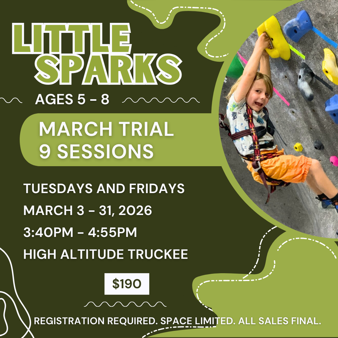 Interested in joining the team but unable to commit? We invite you to this 4 week (8 sessions) Little Sparks beginner team trial that includes 75 minutes of bouldering, auto-belay, and top rope climbing, games and skill development.